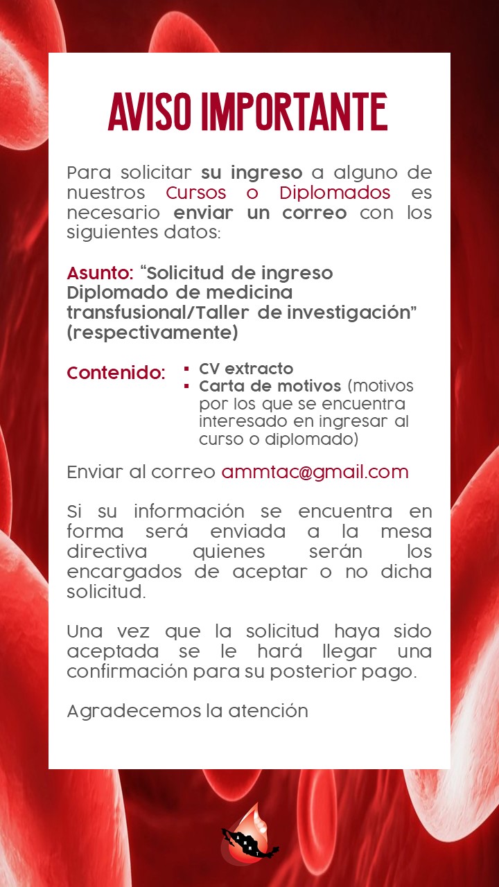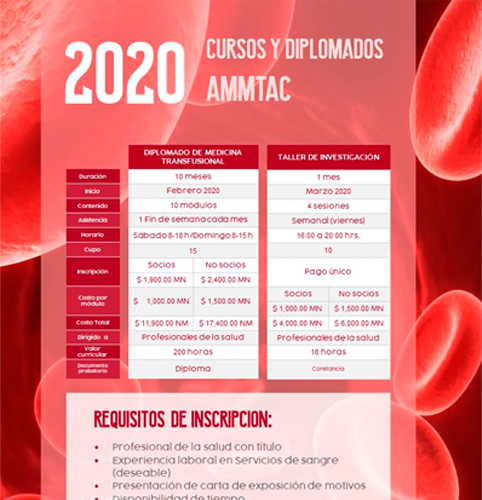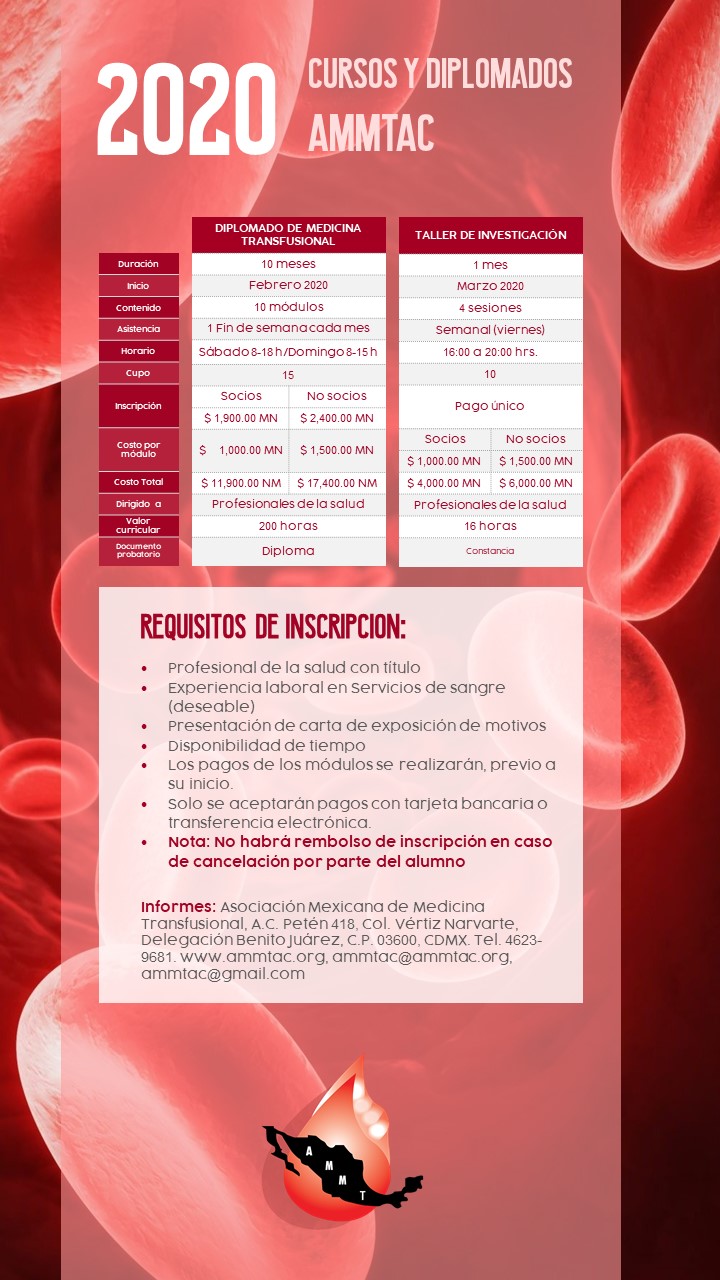 Informes: ASOCIACIÓN MEXICANA DE MEDICINA TRANSFUSIONAL, A. C. Petén No. 418 Col. Vértiz Narvarte, Delegación Benito Juárez, C.P. 03600, México D.F. tel (52)55 4623 9681. ammtac@gmail.com
